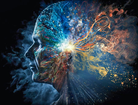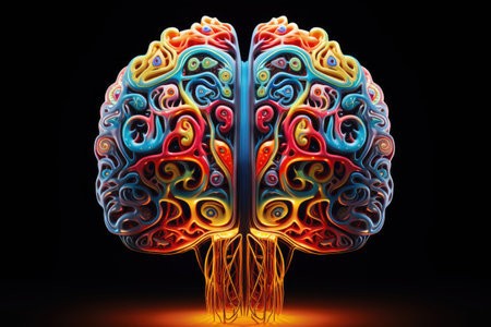 An artistic illustration of a brain with vibrant, colorful neural pathways branching out, symbolizing creativity and thought processes against a dark background