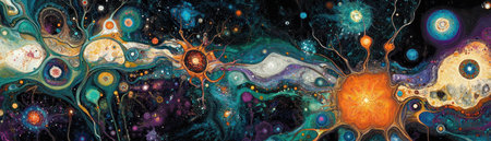 Abstract colorful painting with flowing lines and orbs. Concept of creativity, imagination, and energy.