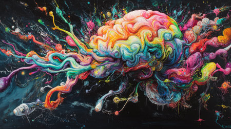 A brain is covered in bright, colorful paint strokes and splashes, symbolizing creativity and imaginative thinking in a playful manner.