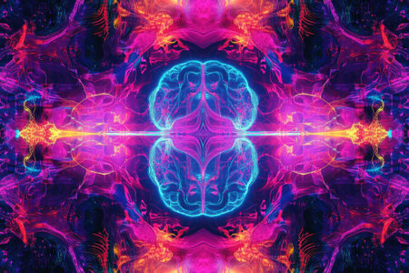 Bright neon colors swirl and pulse in a stunning abstract depiction of brain activity, creating a vivid atmosphere.