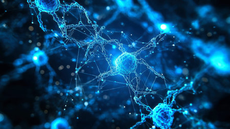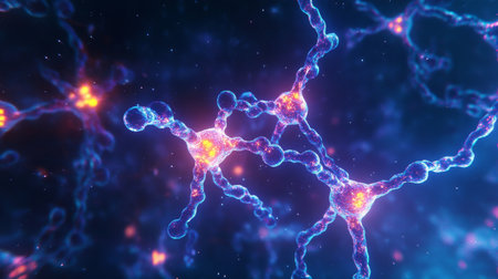 Digital illustration of neuronal cells and synapses with vibrant colors against blue background