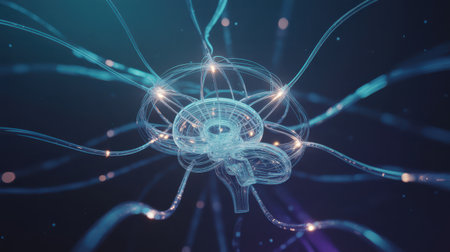 A luminous, abstract 3D rendering of a neural network. The central structure resembles a stylized brain, with interconnected wire-like pathways extending outwards. Glowing points of light, representing synapses, illuminate the connections between nerve cells, conveying a sense of electrical activity and communication.
