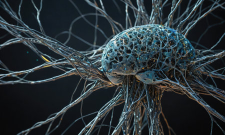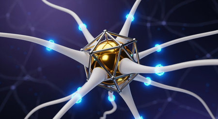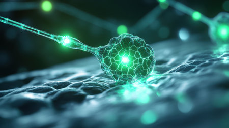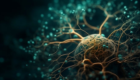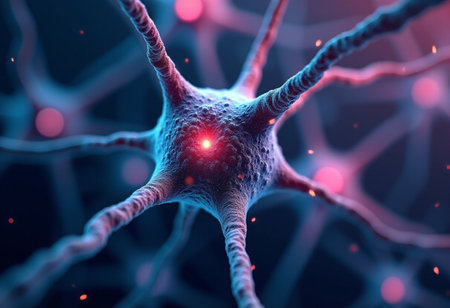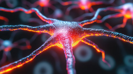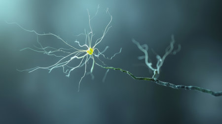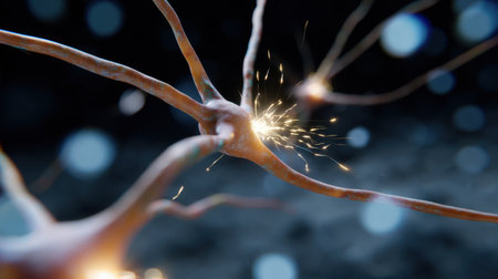 A detailed neuron view showing how botulinum therapy impacts nerve cell communication, highlighting connections and electrical impulses.