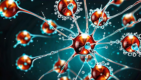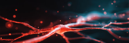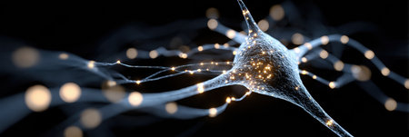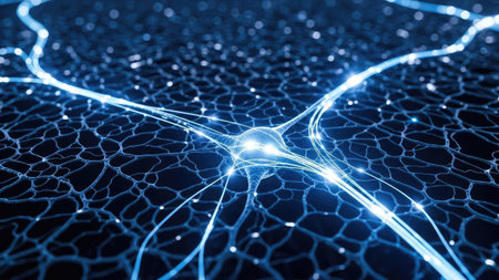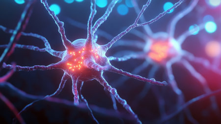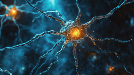 Detailed digital illustration of neurons in action, showcasing synaptic connections and neural networks, perfect for scientific and educational use related to neuroscience.