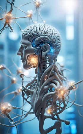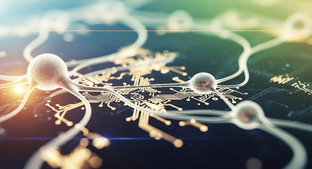 A futuristic illustration of neurons connected to a circuit board with glowing lines