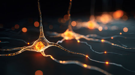 This image presents an abstract view of neurons, depicted with glowing lines and points against a dark background. The composition highlights interconnected structures, showcasing vibrant orange and yellow hues. The artwork's style suggests a focus on digital art, suitable for various science or technology-related applications and editorial purposes.