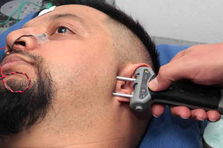 Electromyography EMG and facial nerve conduction velocity NCV to assess nerve damage from facial paralysis in a Latino male