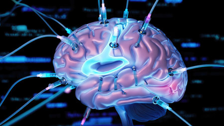 A glowing digital brain with active neuron sparks and cybernetic links. The scene evokes themes of technology, AI, innovation, and neuroscience. Generative AI.