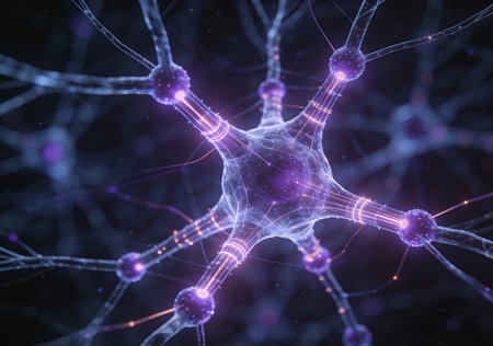 A close-up depiction showcases interconnected neuron cells with glowing nodes and radiating pathways. The artwork features bright blue and purple hues against a dark background. This digital illustration could be used in scientific publications, educational materials, or presentations related to biology and technology.