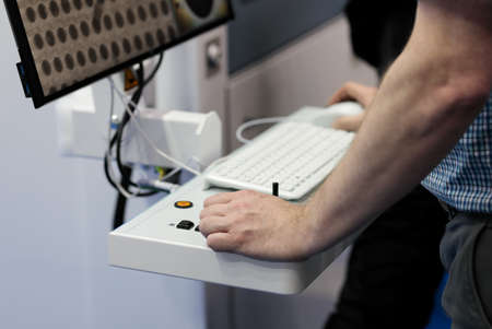 Operator controls x-ray and CT inspection system for checking the quality of PCB assembly. Selective focus.