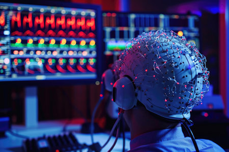 A focused scientist with an EEG cap on their head sits in a lab with multiple screens displaying neurological data.