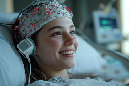 Patient undergoing brainwave monitoring hospital room medical procedure calm environment close-up view neurological study