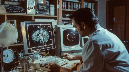 A man wearing headphones sits in front of a computer, engaging in his work or hobby, A futuristic EEG machine reading brainwave patterns, AI Generated