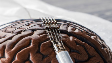 A closeup view of a brain implant device intricately designed with metallic circuits positioned against the textured surface of neural tissue..