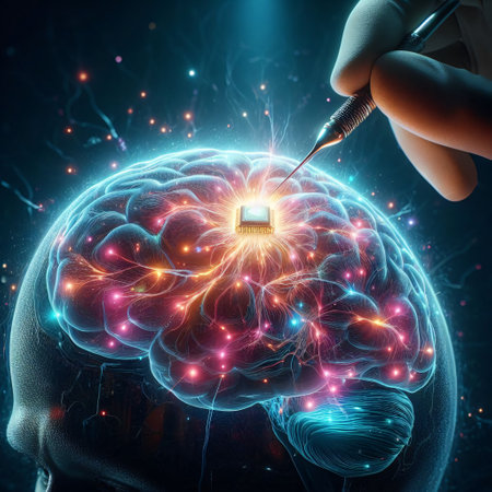 The image captures the essence of futuristic biotechnology, depicting the implantation of a microchip into a brain.