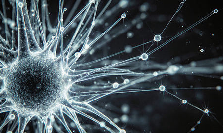 3d rendering of neuron cell with glowing particles, computer generated abstract background