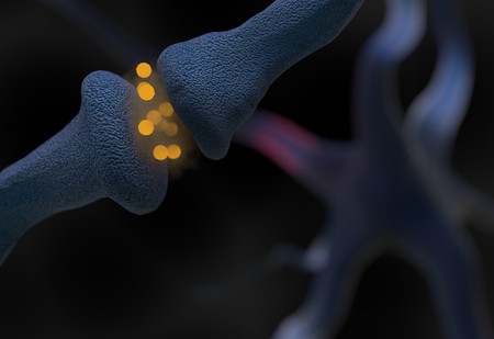 A detailed 3D illustration of a human neuron, showcasing its intricate structure with a central cell body, branching dendrites, and a long axon. The synapses are depicted as glowing yellow points of light, suggesting the transmission of neural impulses. The neuron is set against a dark blue, abstract background, emphasizing its scientific and biological nature.