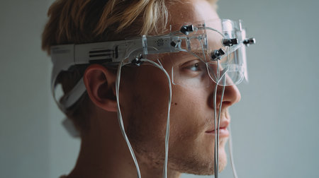 A close observation of a neural interface headset perched on a users head wires connecting to visible neurosensors that monitor brain activity in realtime..
