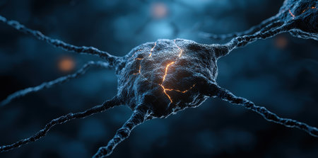 An AI generated illustration of brain neuron with its center illuminated by a glowing orange light