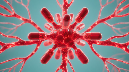 A detailed microscopic image showcasing complex cellular networks, featuring white branching structures intertwined with distinct red and blue spherical particles, suggesting biological or scientific.