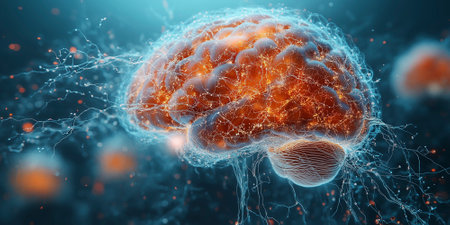 A close up of a brain cell with a blue background. The cell is surrounded by a blue and orange swirl