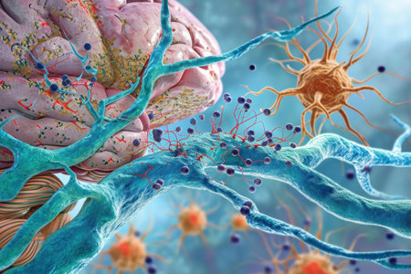 Microscopic view of nerve cells exchanging neurotransmitters, forming connections and transmitting signals crucial for brain function. Generative ai