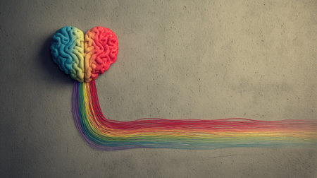 A heart-shaped, colorful brain with a flowing rainbow symbolizes the link between thoughts and emotions creatively.