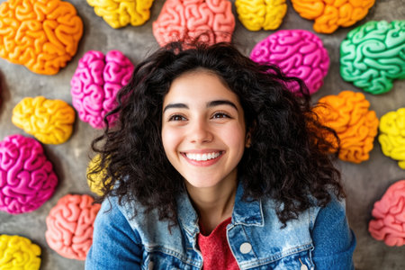 Young Woman Smiling with Colorful Brain Models Hovering in the Air, Concept of Creativity and Knowledge.