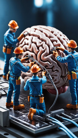 Creative concept showing tiny maintenance workers examining brain model. AI development, cognitive science, brain research, mental health technology and digital innovation.