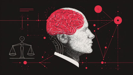 A conceptual illustration features a silhouette of a human head with a red brain, symbolizing the relationship between cognitive processes and legal systems.