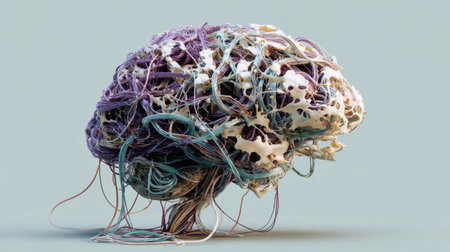 An illustration presents a brain composed of textured, fragmented material, suggesting a complex idea. The image utilizes a neutral color palette with white and gray tones. The composition is likely created digitally, with an emphasis on texture and detail. This image is potentially useful for projects related to psychology, innovation, or conceptual design.