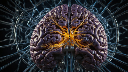 A digital artwork depicting a human brain with intricate wiring, symbolizing the connection between the brain and technology in todays world