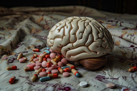 Close up view of an anatomical brain model resting on a bed, surrounded by a variety of colorful pills