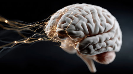 A stunning depiction of a brain with electric sparks illustrating neural connections, showcasing the complexity of thought and cognition in a dark setting.