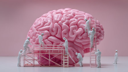 A giant pink brain model surrounded by scientists in protective suits working on research and educational concepts in a modern studio setting.