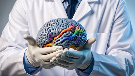 A close-up image of a colorful model brain held in two hands against a light blue background.