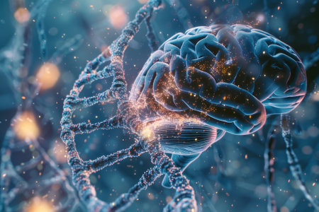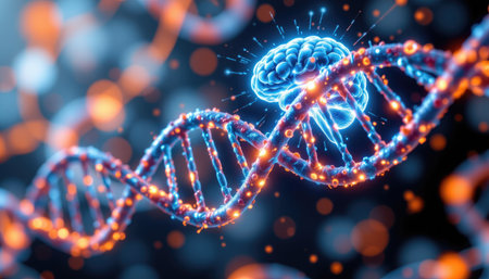 This captivating image features a vivid brain integrated within a DNA helix, representing the convergence of genetics and neuroscience. Ideal for projects related to innovation, research, or technology.