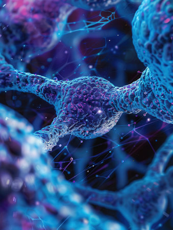 A close-up depiction showcases interconnected neuron cells with glowing nodes and radiating pathways. The artwork features bright blue and purple hues against a dark background. This digital illustration could be used in scientific publications, educational materials, or presentations related to biology and technology.