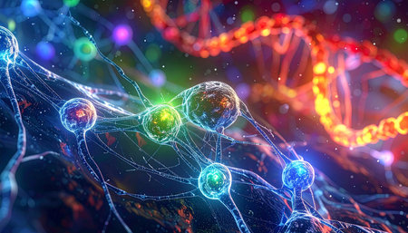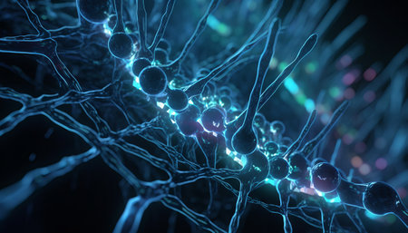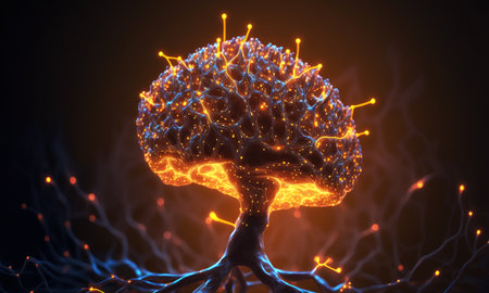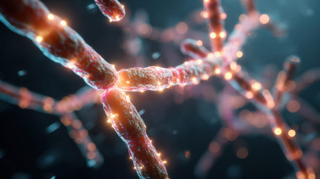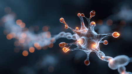 An artistic depiction presents a network of interconnected nodes and lines, resembling a complex biological structure. The composition utilizes a dark background to highlight glowing orbs and pathways in shades of blue and orange. This visualization is suitable for applications in science, technology, and design.