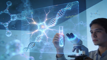 High-tech medical visualization of DNA molecules fusing with neural network connections, glowing in deep blue light