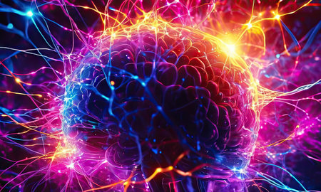 An AI generated illustration of brain comprised of neon lights and multicolored dots, concept of brain activity