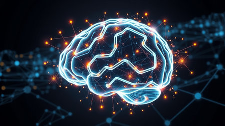 Glowing neural brain model with illuminated connections on dark background.