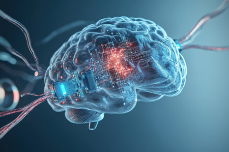 3D rendering of a human brain with circuit board and blue light