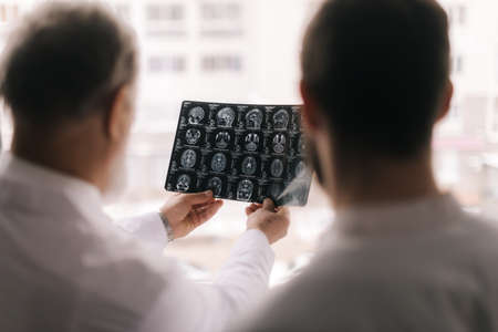 Two doctors discusses the results of an MRI scan of the patients head in the consulting room against a large window. View from the doctors backs, the focus on the X-ray. Concept of team medical work