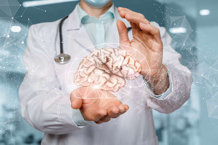 Doctor holding virtual human brain, idea creative intelligence thinking or Awareness of Alzheimer, Parkinson's disease, dementia, stroke, seizure or mental health. Neurology and Psychology care.