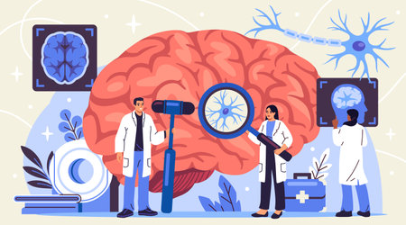 A medical expert is using a stethoscope to examine a detailed model of a human brain, highlighting the anatomical features