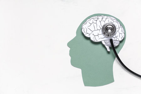 Paper human head with brain and stethoscope on white background. Cancer concept