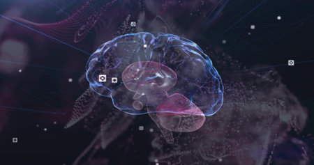 Floating clear brain model showing magenta cerebellum and white data icons in virtual 3D. Cortex, neural, connectivity, visualization, particles, mesh, abstract
