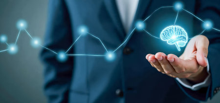 Businessman Holds Advanced Brain Hologram AI, Depicting Futuristic Digital Technology, Artificial Intelligence Interface in Business