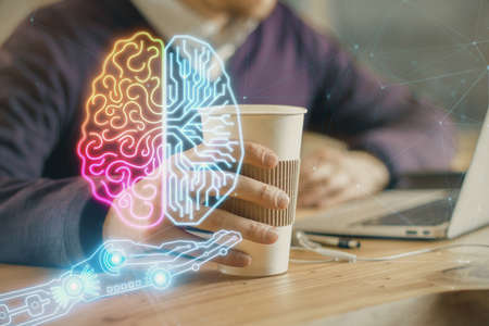 Man hand with pen working with virtual creative artificial Intelligence hologram with human brain sketch on blurred office background. Multiexposure